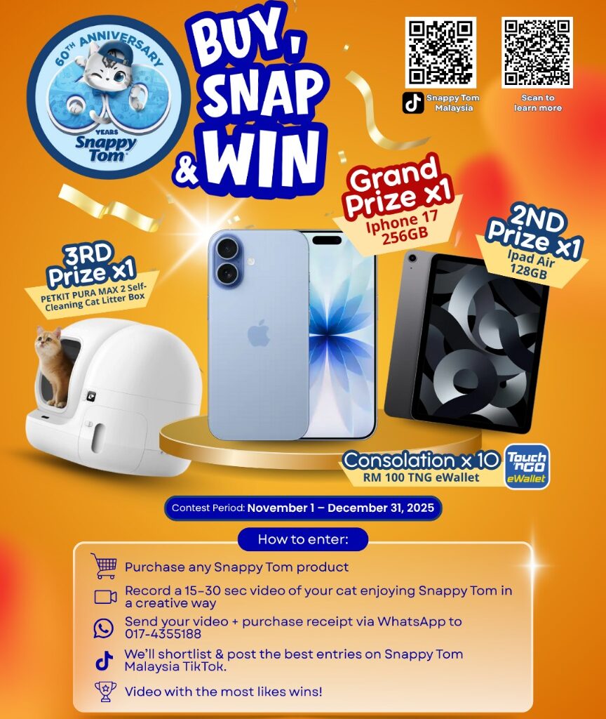 Terms & Conditions 1. Organizer The Snappy Tom 60th Anniversary “Buy, Snap & Win” Contest (“Contest”) is organized by Snappy Tom Malaysia (“the Organizer”). 2. Contest Period The Contest runs from 1 November 2025 to 31 December 2025 (“Contest Period”). All entries received after 31 December 2025, 11:59 PM will not be accepted. The Organizer […]