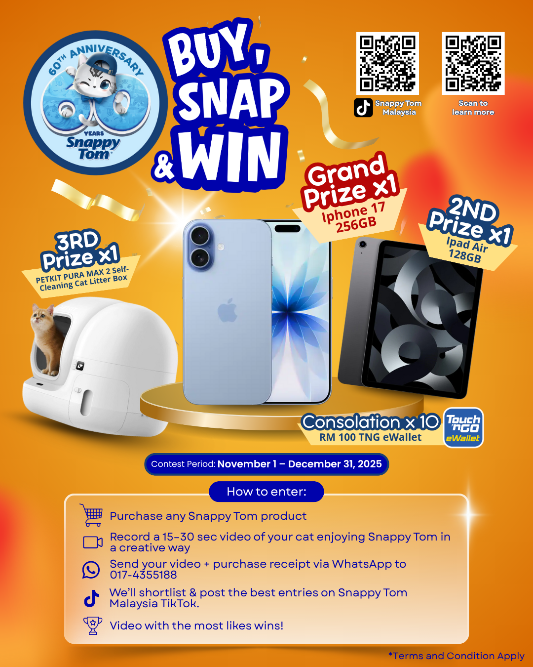 Terms & Conditions 1. Organizer The Snappy Tom 60th Anniversary “Buy, Snap & Win” Contest (“Contest”) is organized by Snappy Tom Malaysia (“the Organizer”). 2.