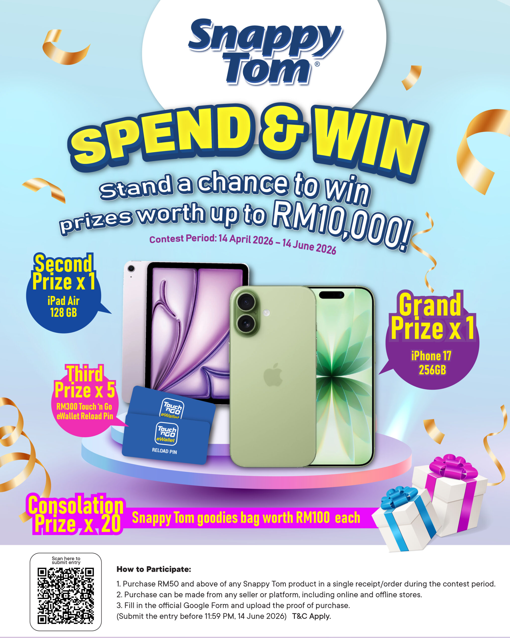 - Purchase RM50 and above of any Snappy Tom product in a single receipt/order during the Contest Period.
